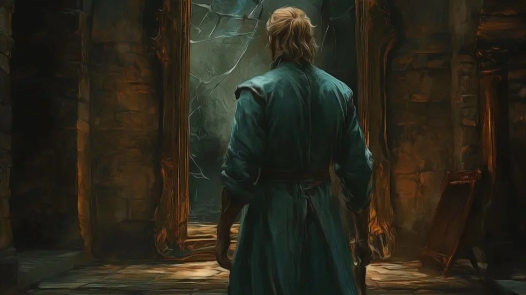 I rise, bare feet whispering against the cold stone floor. Each step is louder in the silence. Three paces from the mirror, I stop. At first, it reflects only the fire behind me—only flicker and shadow.